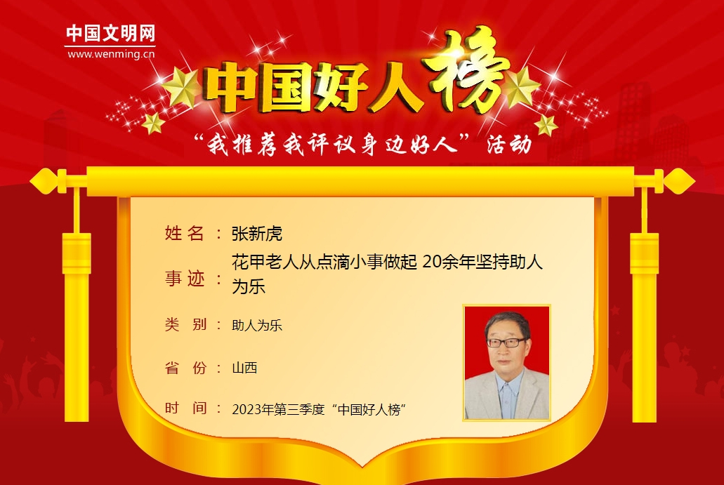 11月12日,中央文明办发布2023年第三季度“中国好人榜”,晋城市张新虎荣登“中国好人榜”。截至目前,我市共有78人上榜中国好人,在全省排名第一。