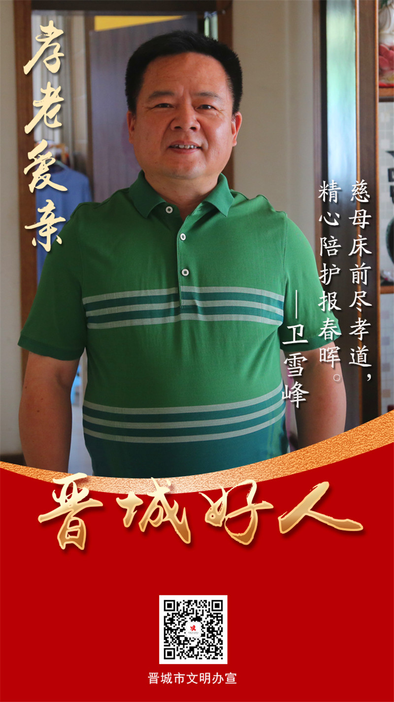 男,1970年10月生,山西兰花科创股份有限公司田悦化肥分公司行政办公室副主任。卫雪峰幼年丧父,性格坚毅的母亲历经艰辛拉扯儿女们长大成人。2007年,本该安享晚年的母亲被确诊为阿尔兹海默症,从一开始偶尔反常的日常行为、无休止的烦躁到后来的生活不能自理,在当时缺乏有效药物的情况下,母亲的病情日益加重,卫雪峰没有一句怨言,从此开始了长达13年的陪伴和照顾——给老人洗澡擦身,喂饭喂药,随身携带信息卡片、配备gps定位装置,制定细致周密的安防措施……。2018年,母亲全身器官衰竭,瘫痪在床,卫雪峰在家中设置了呼吸机、吸痰机、氧气袋等装置,学会了插胃管、插尿管,长达三年的日子里,他和妻子日夜陪护,悉心照看,直至母亲去世。医生说,卫雪峰创造了一个医学奇迹,而卫雪峰却说,羊有跪乳之恩,鸦有反哺之义,为人子,当如此!