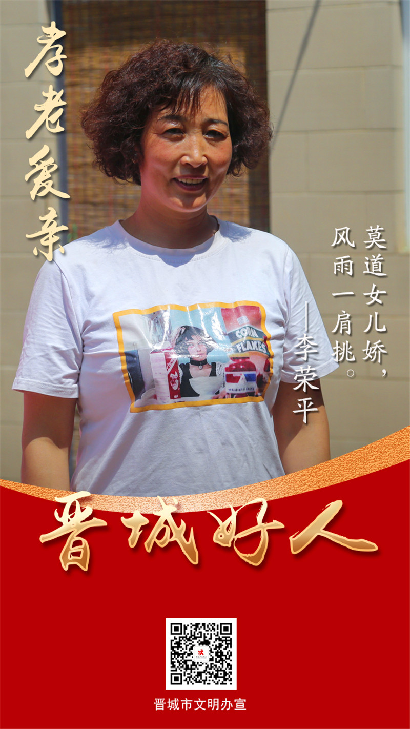 女,1966年11月生,高平市米山镇董寨村村民。李荣平7岁丧父,15岁时,唯一的哥哥也遭遇意外身亡,2010年,丈夫突发脑梗,从此落下了终身残疾。一边是因脑梗半身不遂神智不清的丈夫,一边是常年患病服药的母亲,作为家中唯一的“健康”人,照顾病人的担子就落在了李荣平的头上。为了增加收入,她拼尽全力,种地、卖小吃、开小卖部,给工地做饭;为了照顾病人,她喂饭、擦身、自学按摩,帮助丈夫康复锻炼……,一个女人愣是扛起了全部的家庭责任,勤勤恳恳,从无抱怨。她用十几年的行动印证了那句话——世界以痛吻我,我却报之以歌!