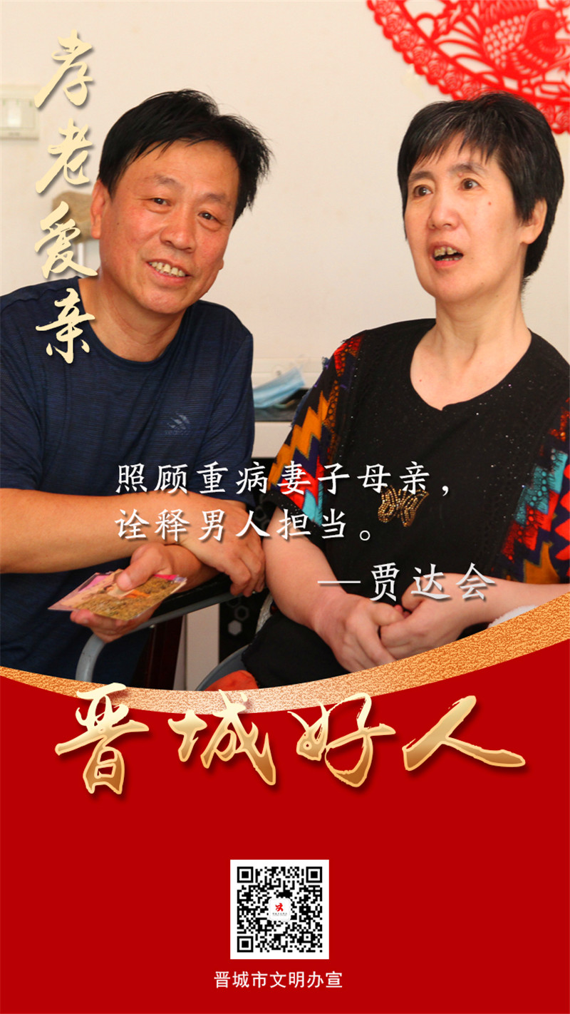 男,1964年10月生,中共党员,城区开发区街道东田石社区支部委员。2010年,46岁的贾达会做为单位的骨干,正是事业发展的上升期,不幸的是,这一年,相伴多年的妻子突发脑溢血,导致半身不遂、生活不能自理。一日夫妻百日恩,看着曾经开朗能干的妻子如今连吃饭吞咽都困难,贾达强忍着心里的难过,开始了十年如一日照料妻子的生活——一日三餐变着花样、喂到嘴里,无论寒暑每天擦拭、按摩身体。2012年,母亲重病在床,他更要分身照看。尽管家庭负担重,但贾达会从未因此影响到工作,反而在单位承担了重要职责。他说,照顾家人,是一个男人应尽的责任,家庭和谐,才能社会和谐,夫妻和睦,才能事业成功。
