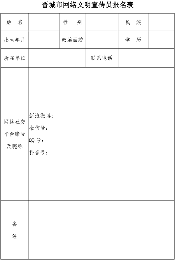 2、集体报名:各单位、各学校组织报名,报名表汇总后报送到晋城市文明办(晋城宾馆院内东楼205)。