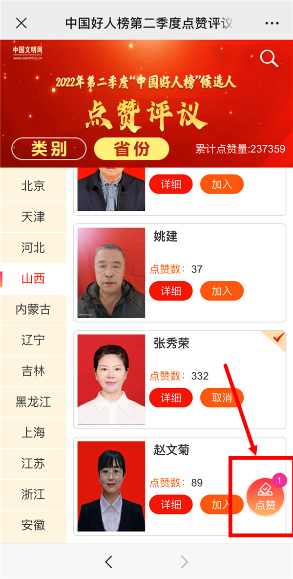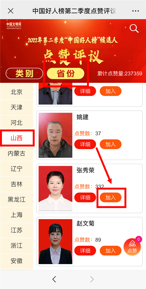 进入后选择省份-山西省,找到晋城的候选人张秀荣,点击“加入”到点赞库。