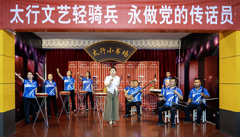 晋城市陵川县盲人曲艺宣传队在太行小书场表演。78年来,这支太行山上的文艺轻骑兵始终坚持自力更生、自强不息的精神,感党恩、听党话、跟党走,用铿锵有力的乐曲,宣传党的路线、方针、政策,活跃山村群众的文化生活。李剑琦 摄