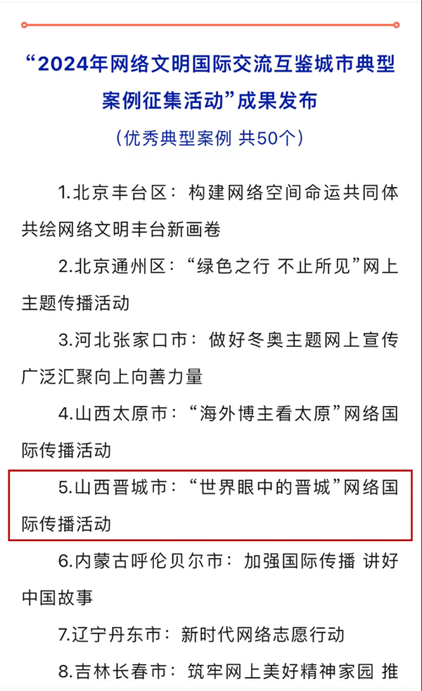 其中,晋城市“世界眼中的晋城”网络国际传播活动入选优秀典型案例。