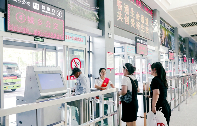 在晋城市客运东站,工作人员在检票口认真核对每位乘客的车票和身份信息,引导乘客排队上车。张理锋 摄