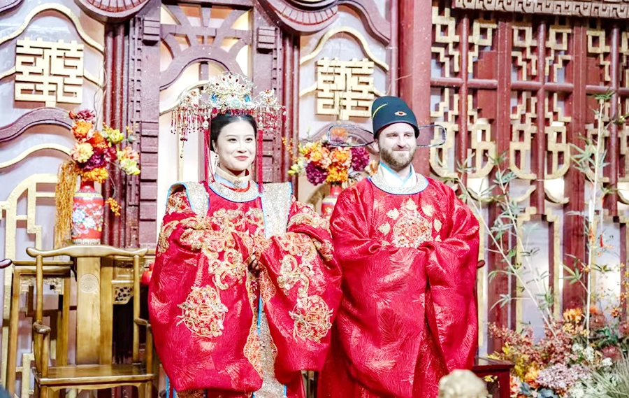 雨果来中国7年,目前在北京外国语大学担任外籍教师,他非常热爱中国文化,在喜镇苏庄举办中式婚礼,是夫妻二人共同的意愿,希望能够领略到高平独特的婚俗文化,感受中国传统婚礼的魅力。“喜镇苏庄保留了很多中国传统的婚俗文化,而且婚礼堂也非常漂亮,有龙、凤凰。我们的礼服也都是他们安排的,我觉得很好看。这个地方特别适合我们结婚。”雨果说,在他热爱的中国遇见了自己的爱人,是一件圆满的事情,中国也早已成为他的第二故乡,他会尽自己努力,用独特的视角,讲述更多更好的中国故事,架起一座中法文化交流的桥梁。(毕一力 牛刚)