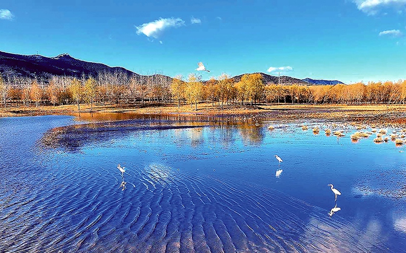 米山湿地公园水域辽阔、景色宜人,随着生态环境的持续向好,近年来越来越多的鸟类选择到这里栖息越冬。(李金莎 摄)