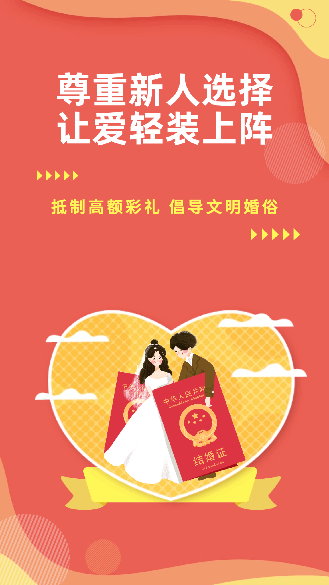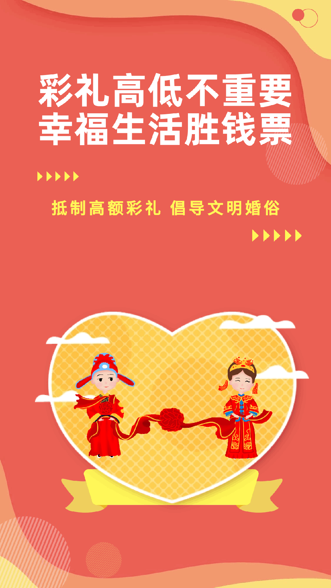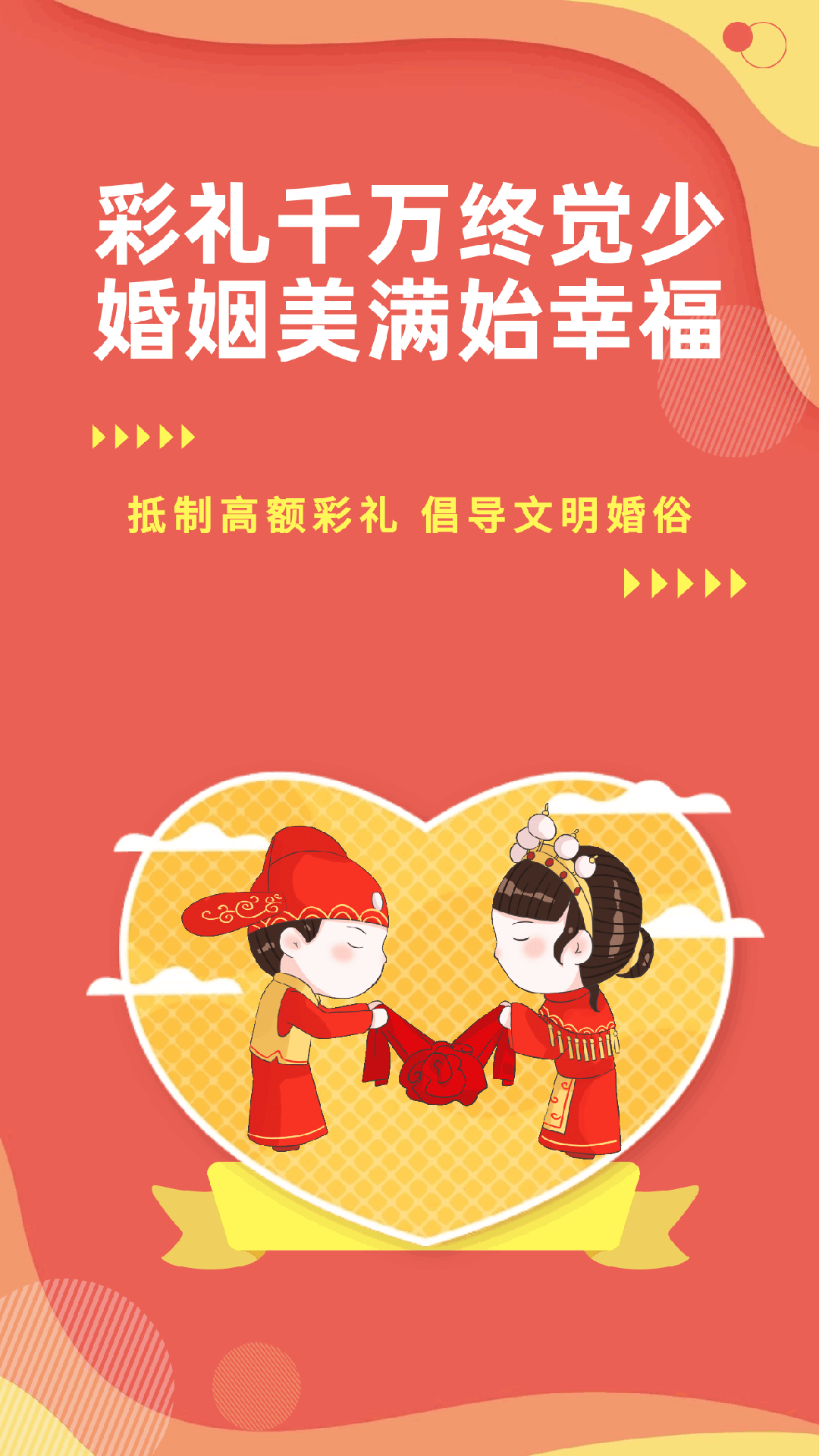 幸福的婚姻是男女青年的梦想,美满的家庭是社会和谐的基础。为弘扬中华传统美德,营造一个简朴、文明的婚庆氛围,引导新人树立正确的婚恋观,让我们一起抵制高额彩礼,树立文明婚俗新风,为爱“减负”,为幸福“加分”。