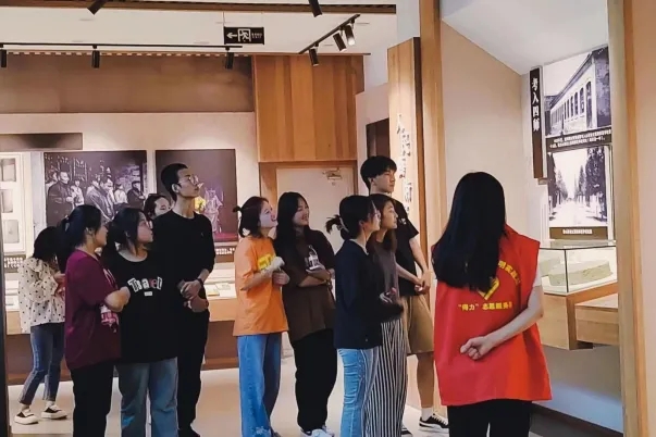 图为赵树理纪念馆内景,“得力”志愿服务队正在向游客讲解