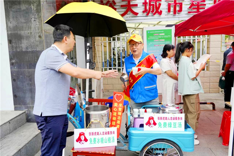 在星河学校考点,依然有“中国好人”张新虎的身影,今年已经是他第8年护考。为方便提供志愿服务,他将小推车换成了三轮车,和往年一样,凌晨4点半他就起床熬绿豆汤,今年还尝试了冰糖山楂汤,全天候免费为考生和家长服务。“学雷锋志愿者流动服务岗”这块牌子背后是张新虎8年护航中高考的坚持,“只要我能动,每次高考我都在”。